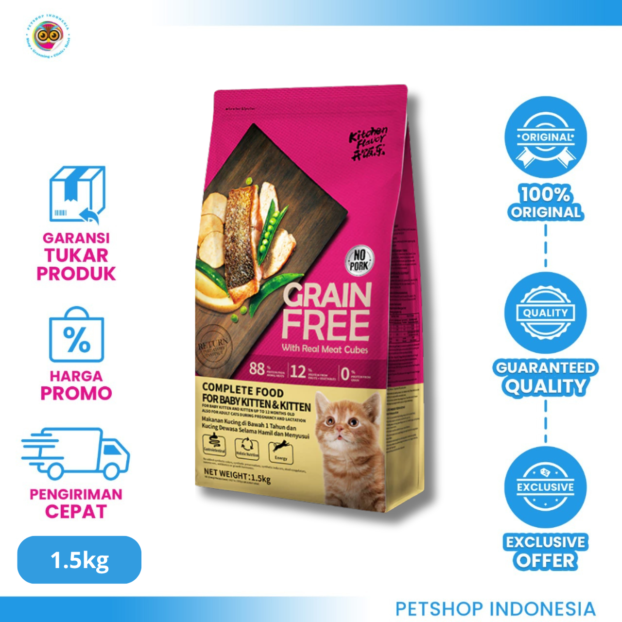 Memberikan Kitchen Flavor Grain Free Baby Cat & Kitten 1.5 kg secara rutin membantu mendukung pertumbuhan dan kesehatan optimal anak kucing Anda. Beberapa manfaat utamanya antara lain: