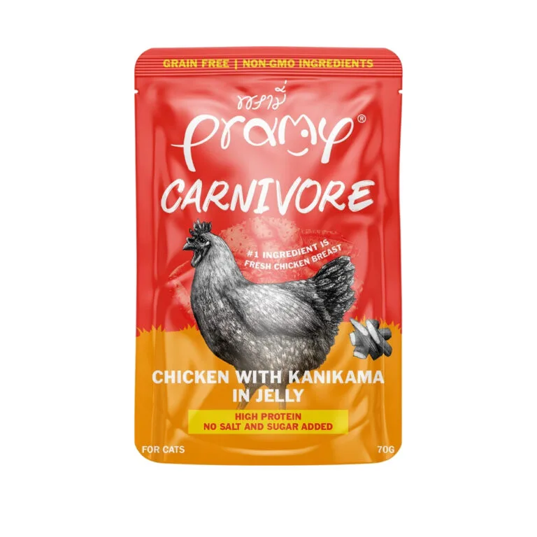 Pramy Carnivore Cat Pouch is formulated with chicken, one of the most popular and nutritious proteins for cats. Chicken is an excellent source of lean protein, essential for muscle maintenance and overall growth. Combined with kanikama (a type of imitation crab), this meal becomes a savory treat that your cat will love. Kanikama is rich in protein and contains essential amino acids that help support a healthy immune system and skin.Pramy Carnivore Cat Pouch Chicken With Kanikama In Jelly 70gm