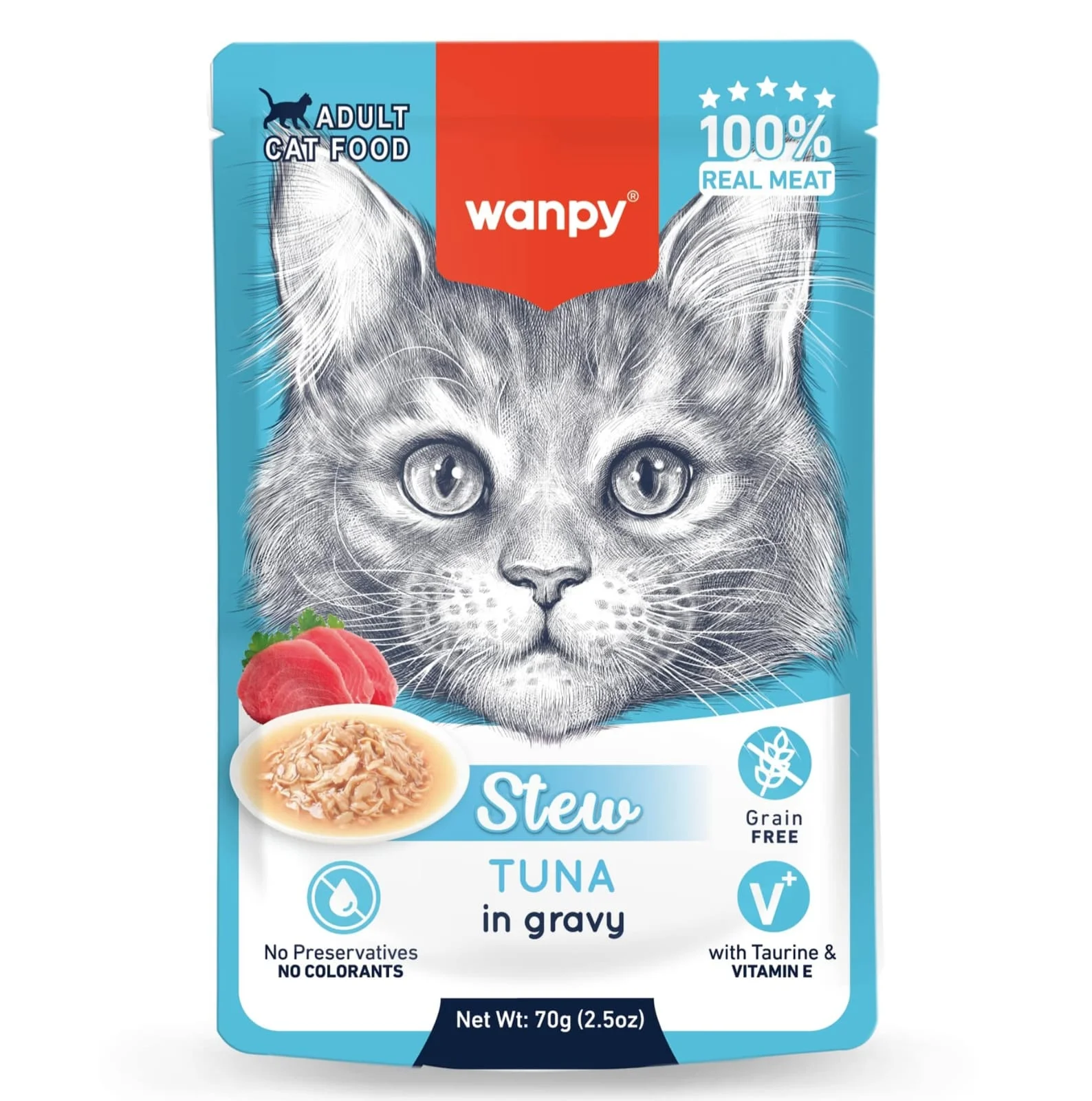 WANPY Stew in Gravy Pouch Cat Food Tuna is the Complete & Balanced Nutrition for Your Cat. Specially Formulated for Adult Cats Aged Above 12 Months. Suitable for Cats of All Breeds. Every Product of Wanpy Maintains Pure Super Premium Quality Standard. It’s Number # 1 Selling Wet Food Brand in China. WANPY Contains NO SALT, NO PRESERVATIVES, NO COLOURS & NO SODIUM NITRATES. WANPY Stew in Gravy Pouch is a Yummy Wet Food that Cats of All Breeds Love to Eat and It’s Very Easy to Digest. This Delicious Meal Providing 100% of All Essential Nutrients that Cats Need to Stay Healthy and Strong. Made with Best Quality Ingredients Sourced from Nature. Made of Quality Fish to Provide Amino Acids to Maintain Good Muscle Mass by Giving High Protein. Optimum Fat Ensures High Energy and Essential Fatty Acids Maintain Healthy Skin and Shiny Coat. All Necessary Vitamins for Body Functions and Enhancement of the Immune System are Included. All Necessary Minerals for Body Functions and Strengthen Bones and Teeth are Included. Taurine Plus Ensures Proper Eye & Brain Function.